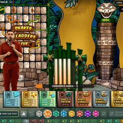 Au sein d’un sympathique décor coloré évoquant une jungle en carton-pâte, Snakes & Ladders Live se présente sous la forme d’un jeu de dés avec croupier en direct.
