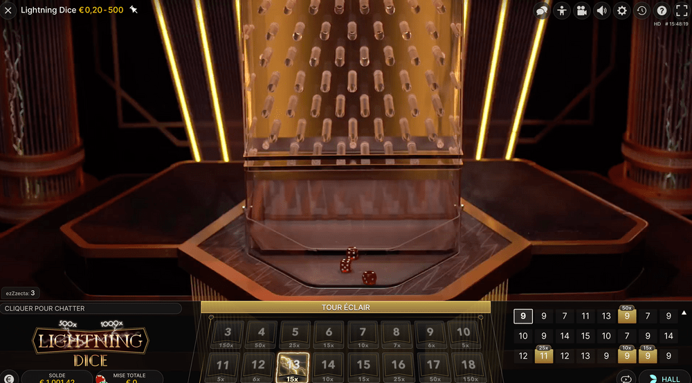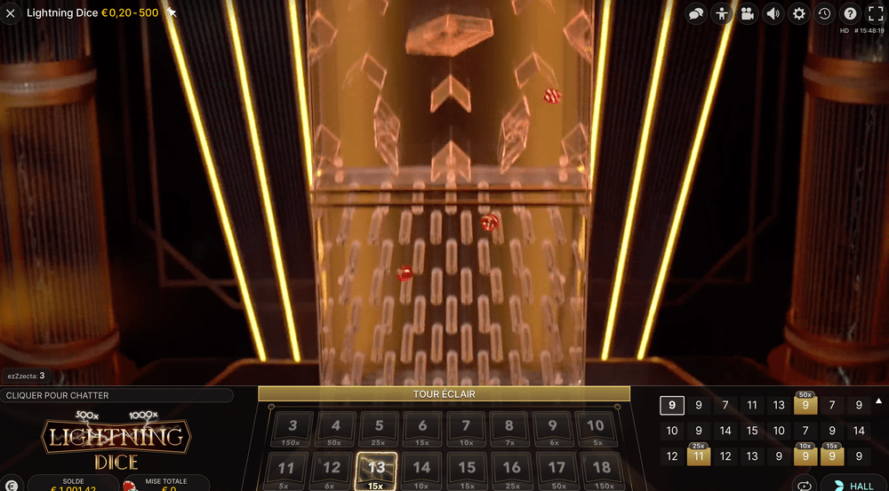 Au début de l’année 2019, le logiciel Evolution Gaming a récidivé en proposant aux Internautes Lightning Dice. Il s’agit d’un jeu de dés en direct très proche du sic bo. Le but est donc de parier sur le résultat de 3 dés lancés dans une sorte de pachinko. Grâce aux paris de base, on peut déjà profiter de rapports de gains généreux allant jusqu’à 150 contre 1. En prime, on bénéficie là encore de multiplicateurs. Ainsi, lors d’une partie, il est possible de remporter jusqu’au 1 000 fois notre mise.