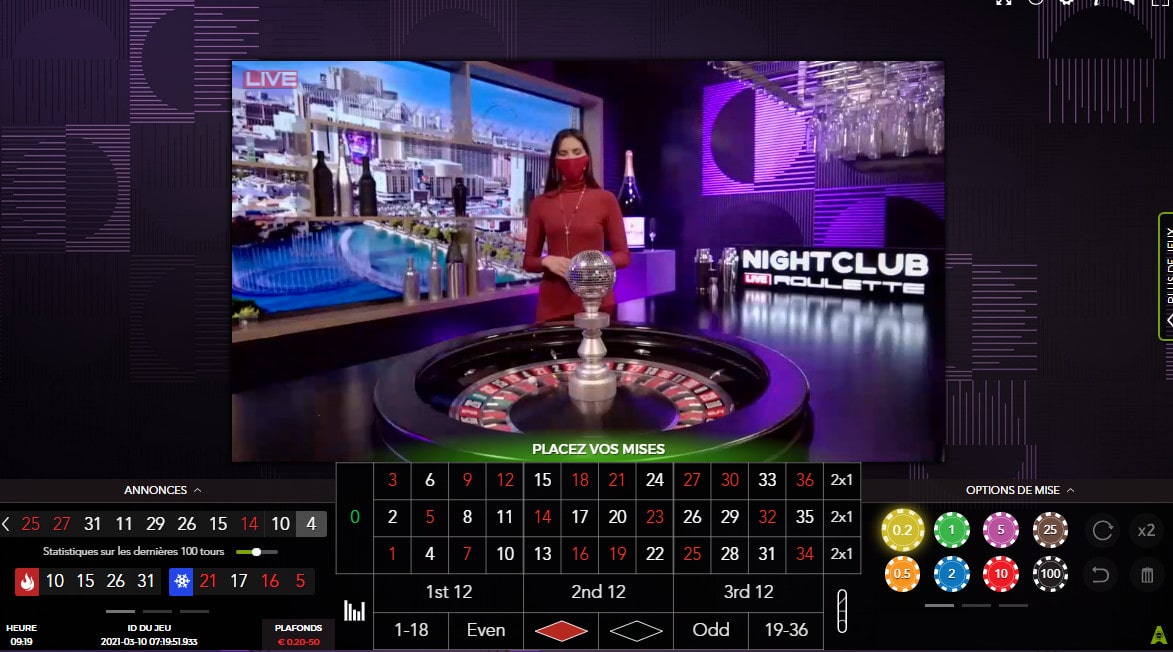 Dans Nightclub Roulette, on profite des règles traditionnelles de ce grand classique. Au cours de nos parties, on peut ainsi parier entre 0,60€ et 10 000€ en tout sur les différentes mises habituelles. Le principal attrait de cette table en direct réside dans son atmosphère. En effet, ce jeu live est filmé dans un superbe studio à la décoration soignée qui rappelle l’intérieur d’une discothèque.