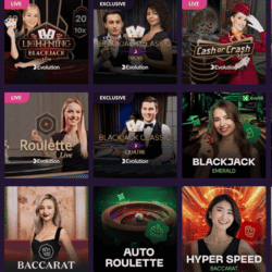 Elle réunit plus de 250 jeux animés par des croupiers en direct. Ils sont signés par les logiciels de grand tablent Live88 mais aussi et surtout Evolution.
