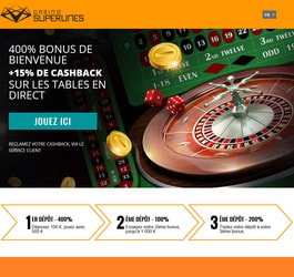 Casino Superlines offre de nombreux bonus dont 400% à jusqu’à 1000€ sur le premier dépôt et sur les autres dépôts. Certes, des conditions de mises sont imposées à savoir 30 fois le montant du dépôt et du bonus. On a pour habitude de conseiller à jouer sans bonus histoire de retirer ses gains à tout moment. Les joueurs de Croupiers en Direct peuvent recevoir 15% de cashback sur les tables en live !