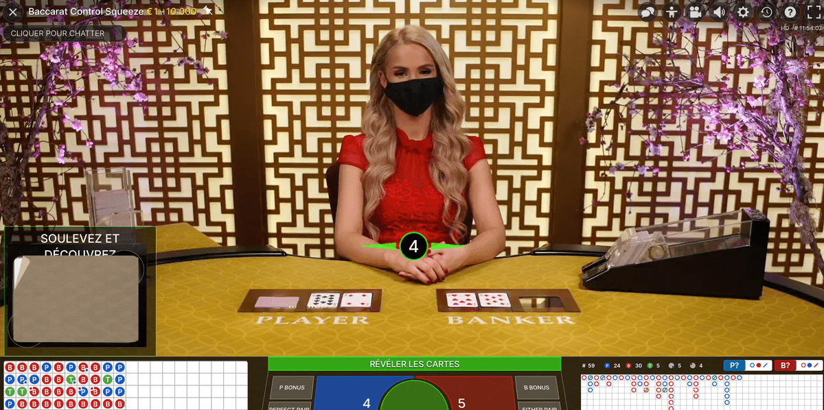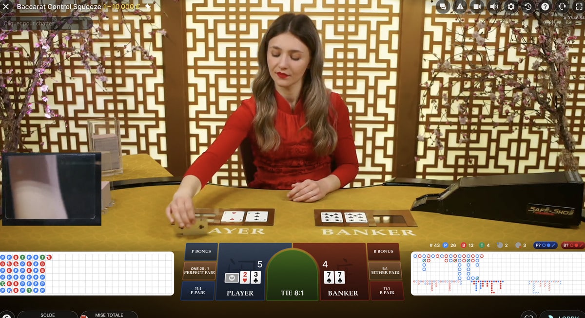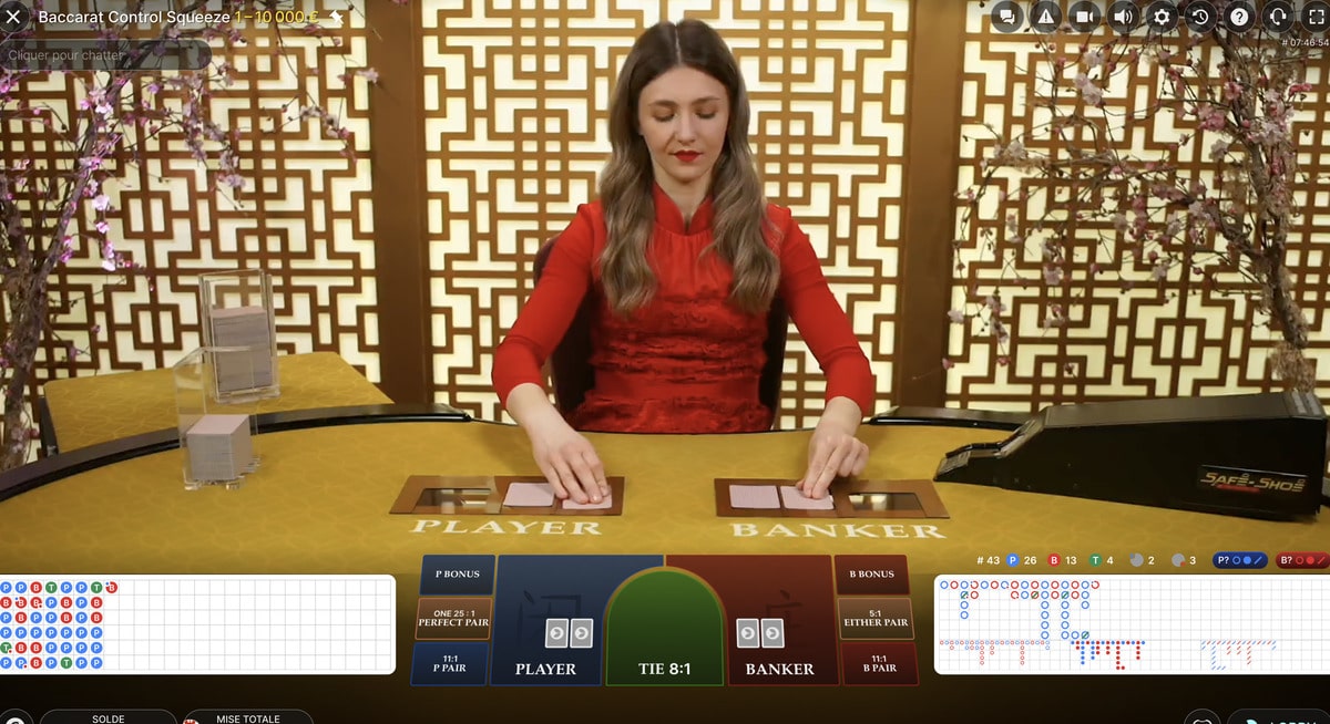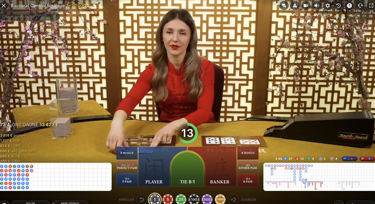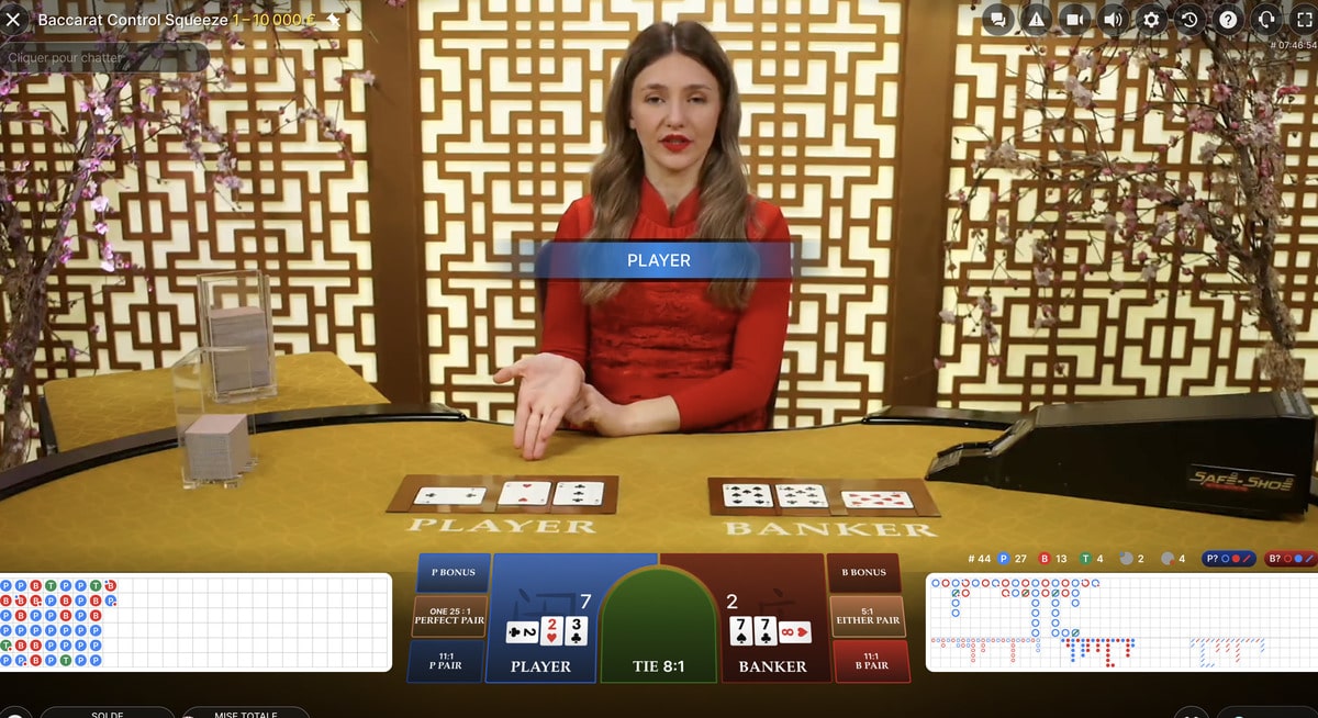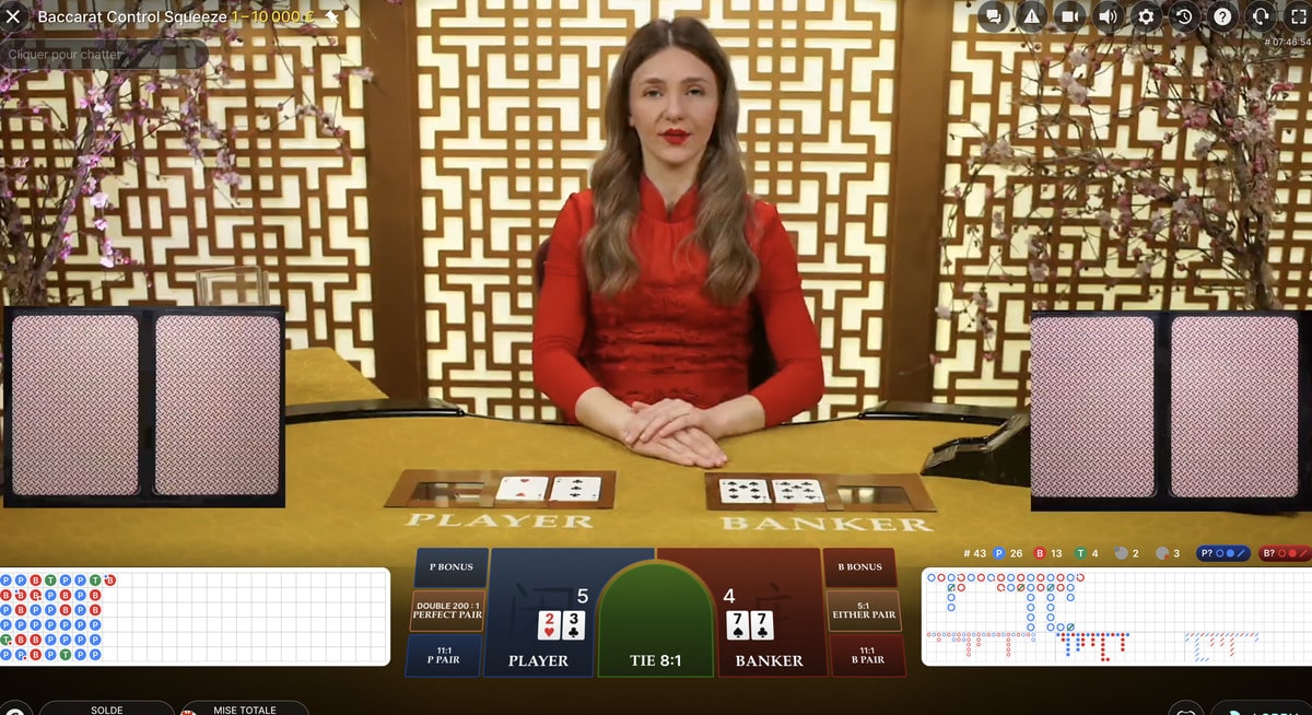 Pour rappel, Baccarat Squeeze était jusqu’à maintenant la variante la plus moderne du jeu, développé par Evolution Gaming. Dans celle-ci, la croupière qui anime le jeu y apporte une intéressante dose d’excitation en gardant le suspense sur l’identité de la deuxième carte du Banquier.