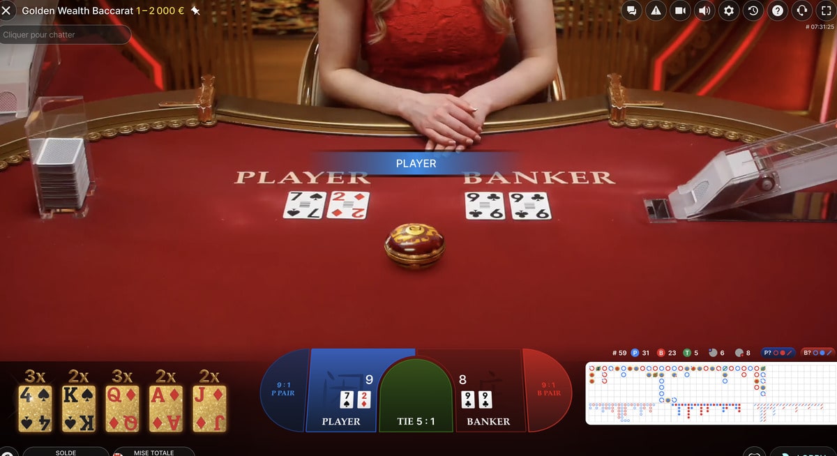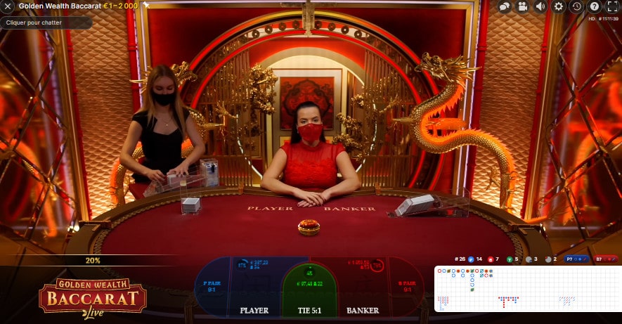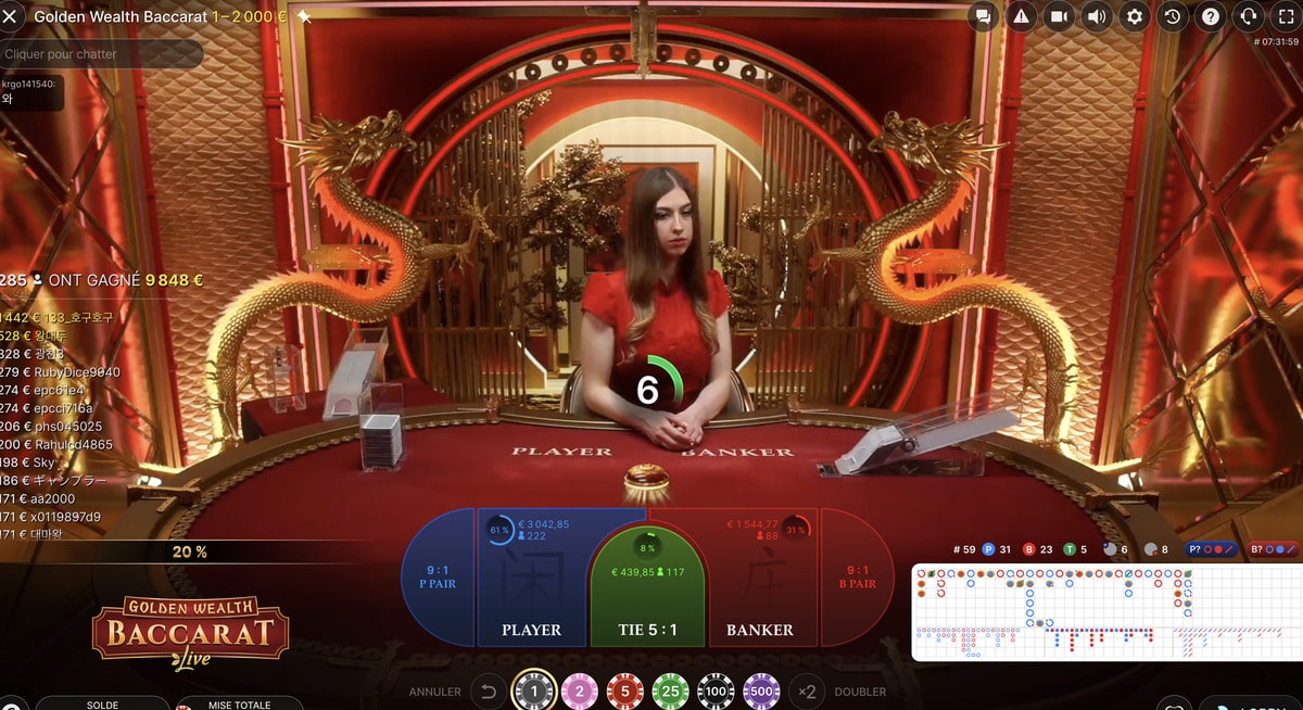 Au cours du mois d’octobre 2021, le logiciel de jeux en live Evolution a sorti la table de baccarat en live avec croupier en direct Golden Wealth Baccarat.