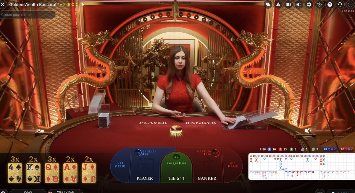 Comme souvent dans la rubrique Baccarat du logiciel Evolution, elle met à l’honneur le rouge et le dorée dans une ambiance asiatique du meilleur goût.