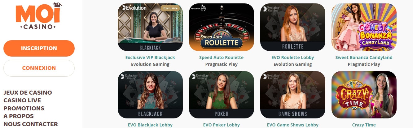 La ludothèque de MoiCasino ne se limite pas uniquement à ses seuls jeux sous RNG. En effet, on trouve aussi dans son lobby une rubrique Live Casino qui possède largement de quoi ravir le plus grand nombre. C’est que là encore les noms prestigieux ne manquent pas. Ainsi, ce sont Vivo Gaming et Ezugi qui s’offrent à nous mais aussi et surtout Pragmatic Play Live Casino et Evolution.