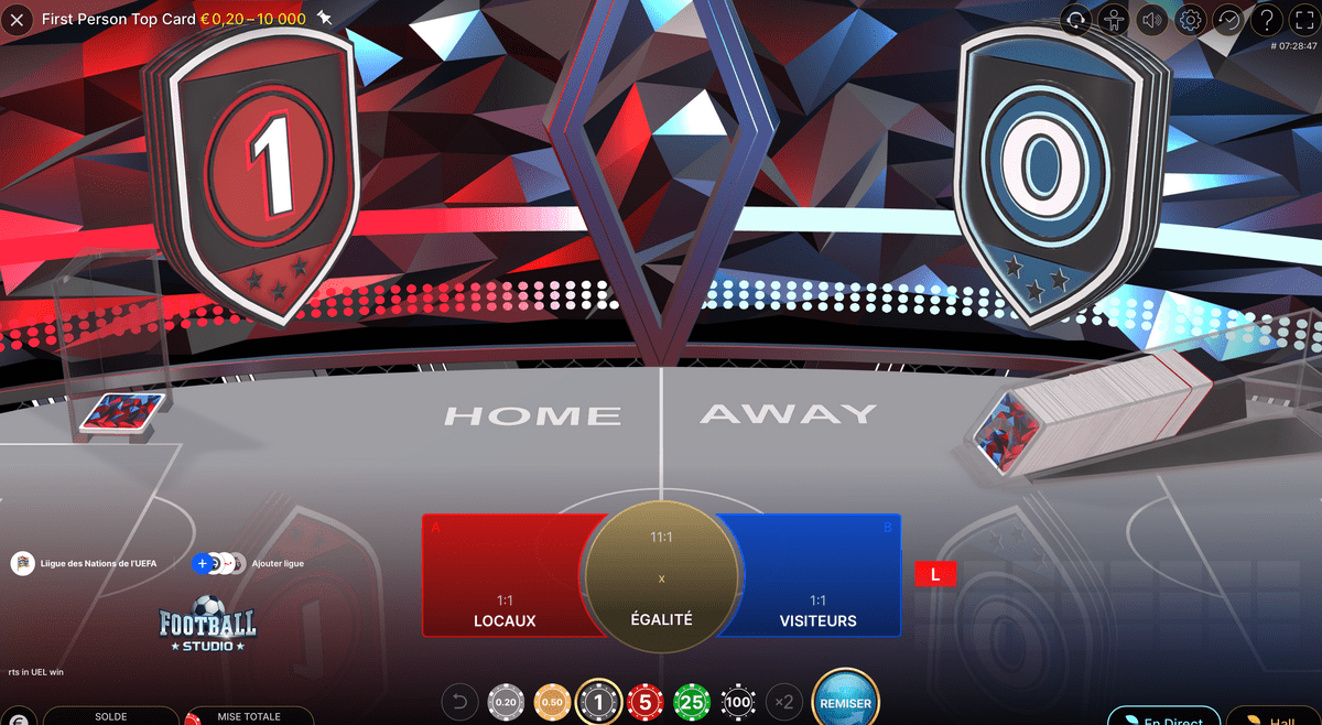 Tout en bas de l’écran, il y a à gauche un rappel de notre solde et un décompte de notre mise actuelle sur la table. De l’autre côté, on trouve à droite deux boutons intéressants. Celui marqué En direct permet de passer en un clic sur le jeu live Football Studio.