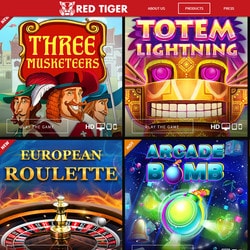 L’offre de cet éditeur est principalement axée sur les machines à sous. Celles-ci constituent l’essentiel de son offre. Abordant généralement des thématiques basées sur la culture asiatique et la culture américaine, ces dernières se distinguent par leur grande originalité, leurs univers graphiques bien structurés et leurs belles animations sonores. Parmi les 40 jeux qui constituent cette ludothèque, on peut notamment citer Ten Elements, Arcad Bomb, Lucky Easter, Crazy Genie ou encore Lucky Wizard. Quelques jeux de table sont également présents dans la ludothèque de Red Tiger Gaming.