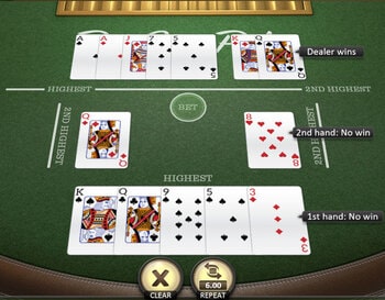 Enfin, le croupier gagne la partie s’il obtient deux mains plus fortes que le joueur ou s’il y a une égalité sur l’une ou les deux mains. Dans ce cas, le joueur perd son pari.