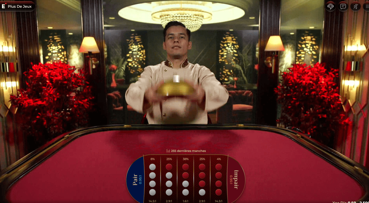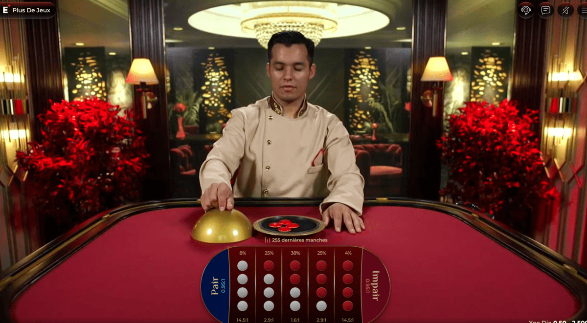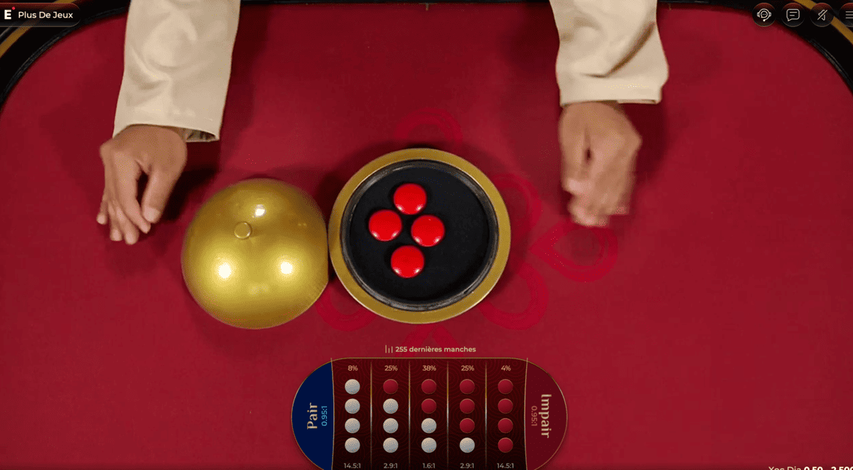 Dans le jeu en live signé Ezugi, on peut voir le croupier en chair et en os utiliser une assiette et un couvercle incurvé pour mélanger 4 jetons affichant une face rouge et une face blanche.